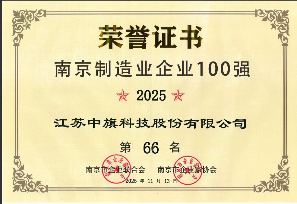 2025年11月13日,“南京市制造業百強企業”榜單正式發布,中旗股份憑借過去一年在經營業績、創新能力及綜合實力上的卓越表現,再次成功入選,這是中旗股份自2019年連續7年入選。